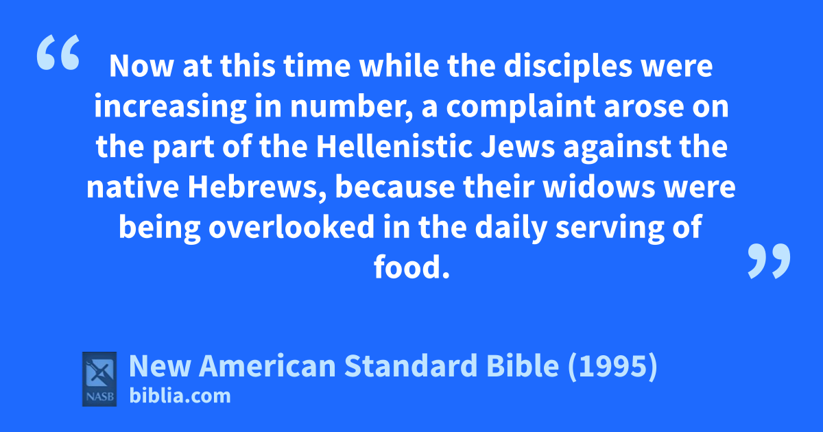 1 Now 1at this time while the adisciples were bincreasing in number, a complaint arose on the part of the 2cHellenistic Jews against the native dHebrews, because their ewidows were being overlooked in fthe daily serving of food.