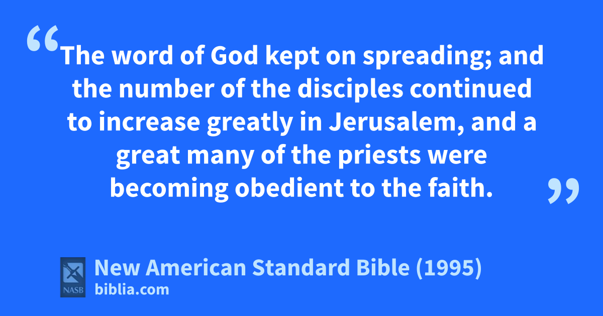7 aThe word of God kept on spreading; and bthe number of the disciples continued to increase greatly in Jerusalem, and a great many of the priests were becoming obedient to cthe faith.