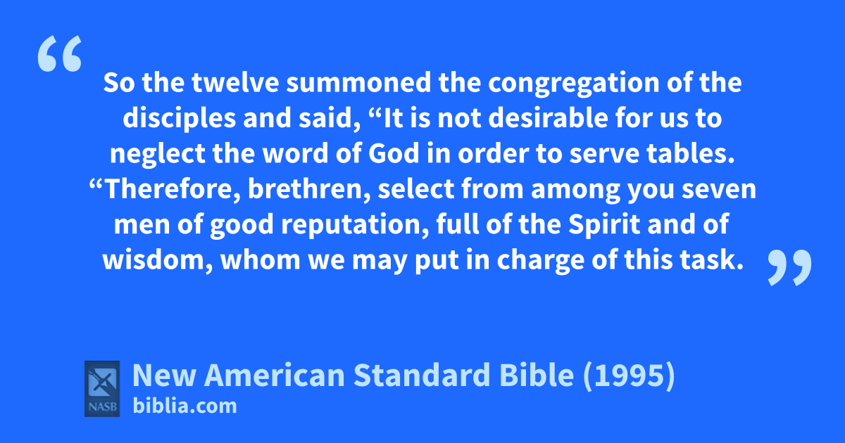 2 So the twelve summoned the 1congregation of the disciples and said, “It is not desirable for us to neglect the word of God in order to serve tables.