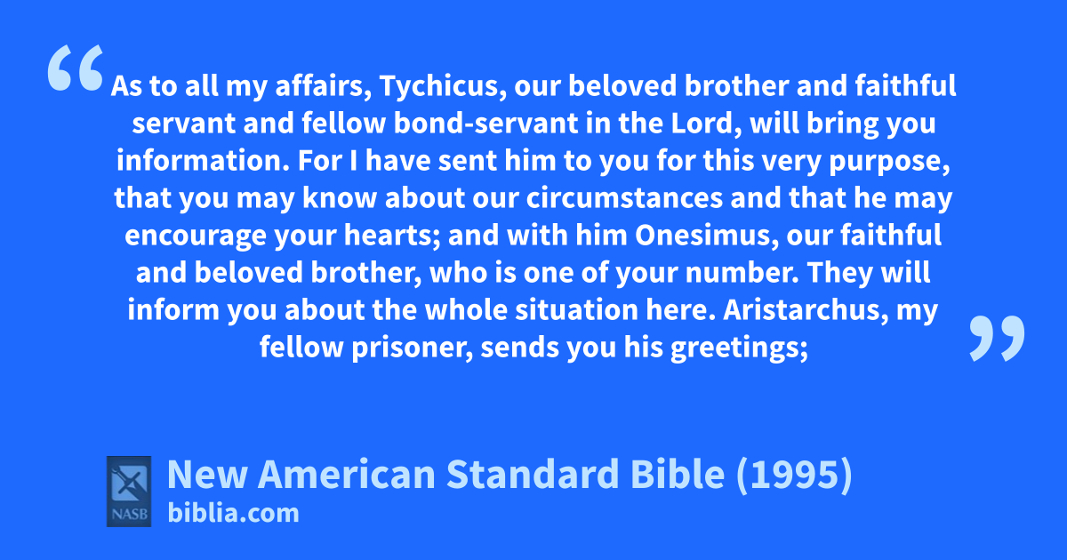 7 aAs to all my affairs, bTychicus, our cbeloved brother and faithful servant and fellow bond-servant in the Lord, will bring you information.
