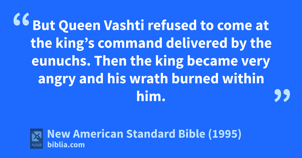 12 But Queen Vashti refused to come at the king’s command delivered by the eunuchs. Then the king became very angry and his wrath burned within him.