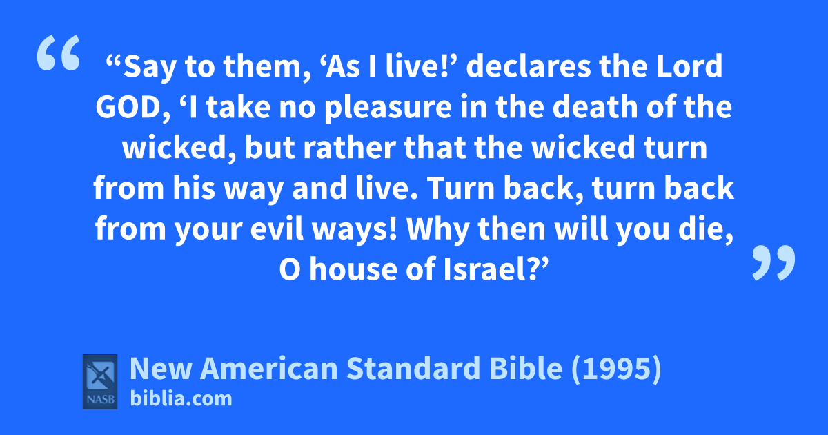 11 “Say to them, ‘aAs I live!’ declares the Lord 1God, ‘I take bno pleasure in the death of the wicked, but rather that the wicked cturn from his way and live. dTurn back, turn back from your evil ways! Why then will you die, O house of Israel?’