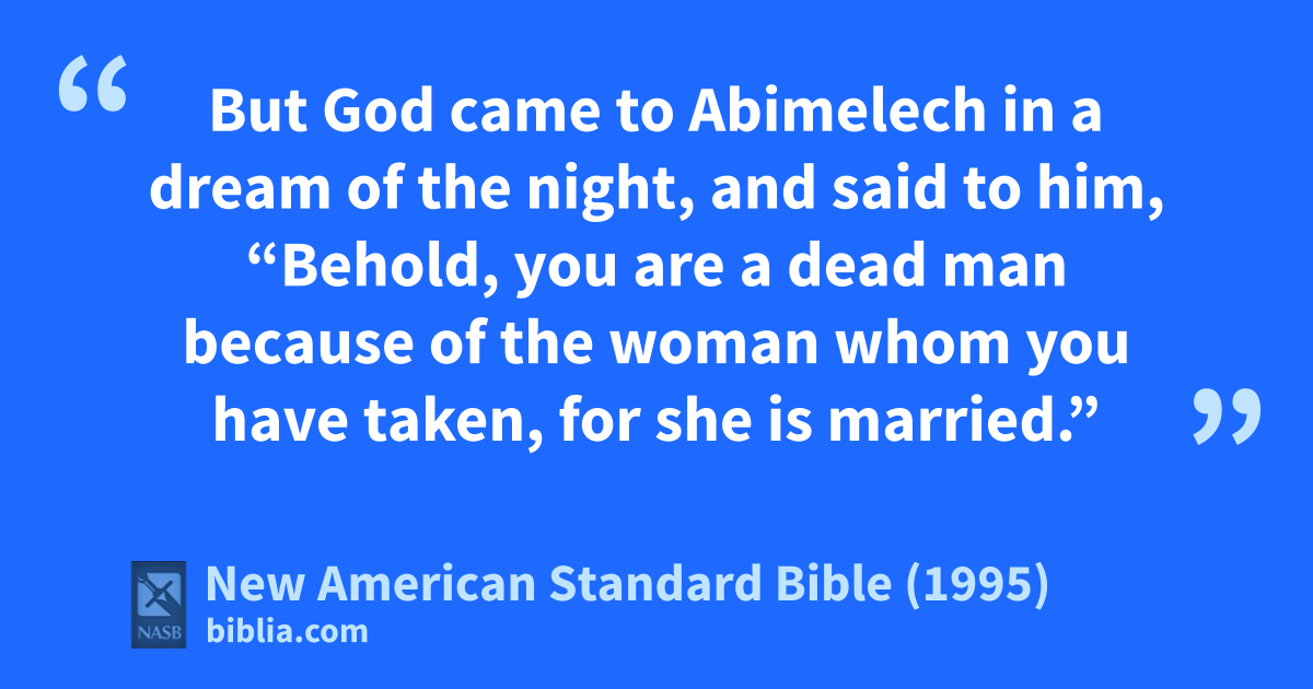 3 aBut God came to Abimelech in a dream of the night, and said to him, “Behold, byou are a dead man because of the woman whom you have taken, for she is 1married.”