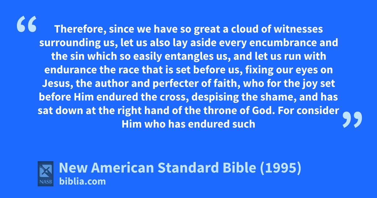 1 Therefore, since we have so great a cloud of witnesses surrounding us, let us also alay aside every encumbrance and the sin which so easily entangles us, and let us brun with cendurance the race that is set before us,
