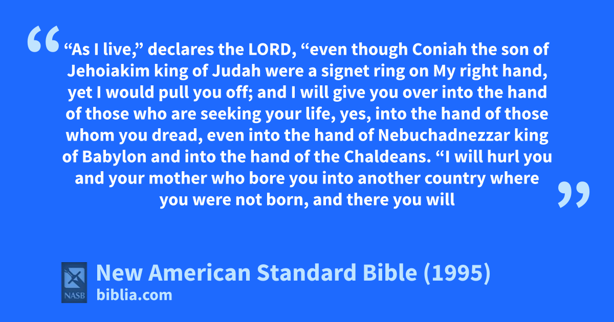 24 “As I live,” declares the Lord, “even though 1aConiah the son of Jehoiakim king of Judah were a bsignet ring on My right hand, yet I would pull 1you 2off;