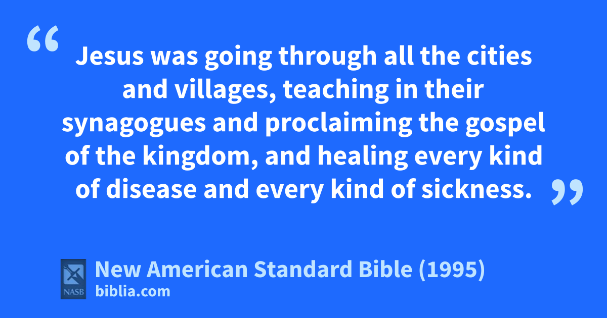 35 Jesus was going through all the cities and villages, ateaching in their synagogues and proclaiming the gospel of the kingdom, and healing every kind of disease and every kind of sickness.