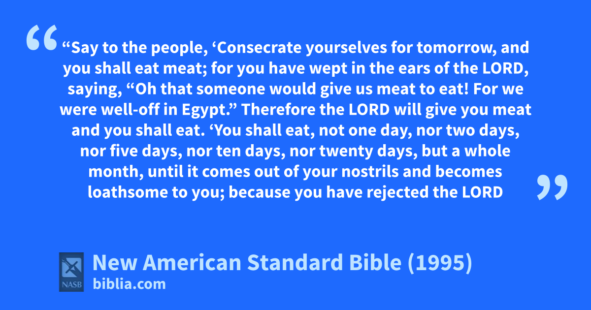 18 “Say to the people, ‘aConsecrate yourselves for tomorrow, and you shall eat meat; for you have wept bin the ears of the Lord, saying, “Oh that someone would give us meat to eat! For we were well-off in Egypt.” Therefore the Lord will give you meat and you shall eat.