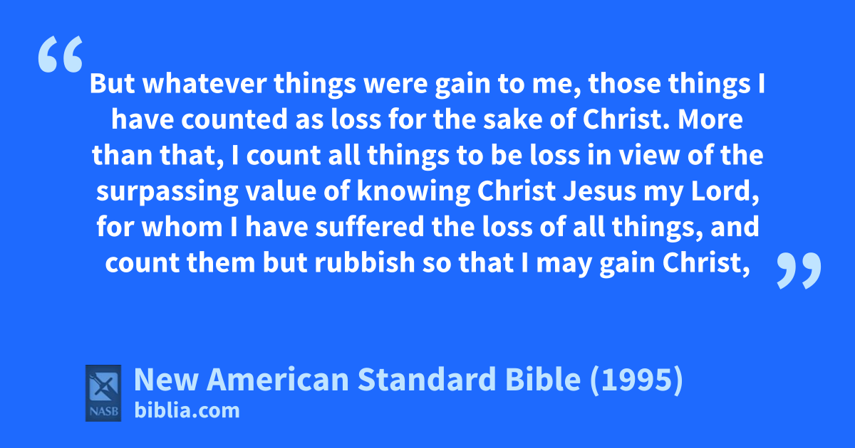 8 More than that, I count all things to be loss 1in view of the surpassing value of 2aknowing bChrist Jesus my Lord, 1for whom I have suffered the loss of all things, and count them but rubbish so that I may gain Christ,