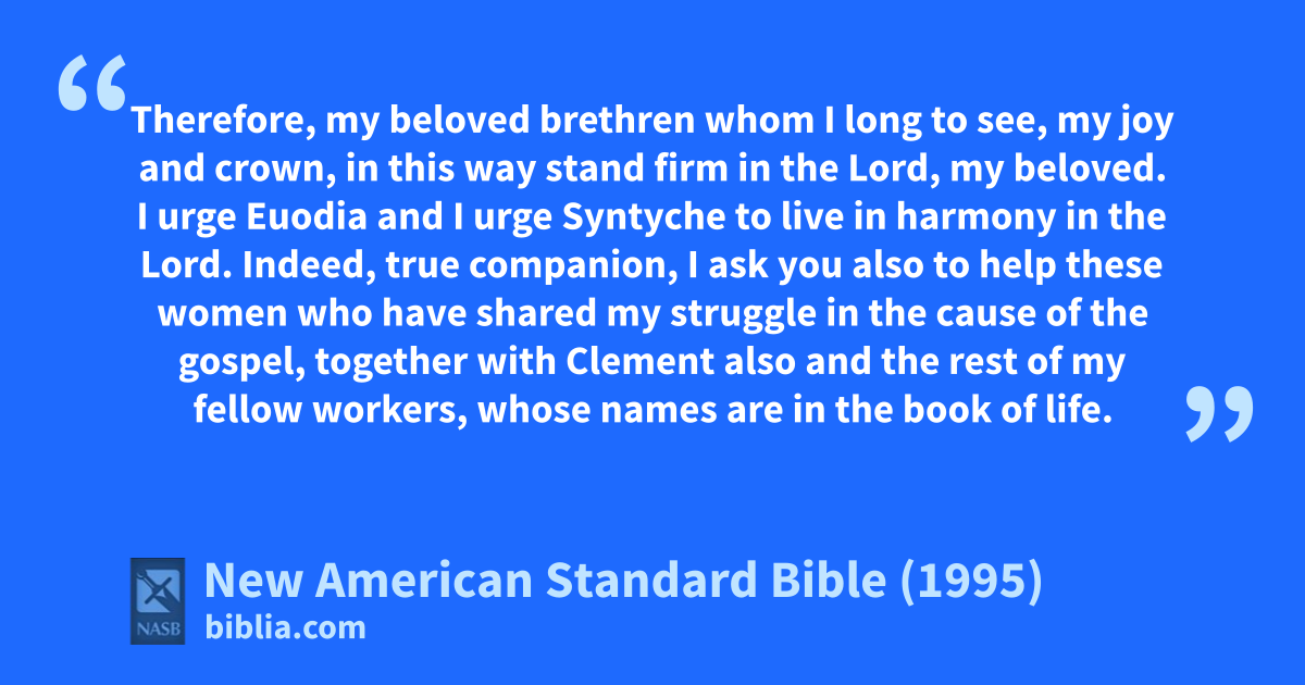3 Indeed, true companion, I ask you also to help these women who have shared my struggle in the cause of the gospel, together with Clement also and the rest of my afellow workers, whose bnames are in the book of life.