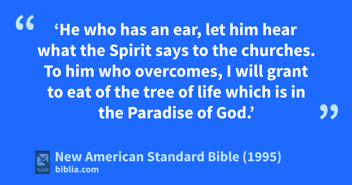 7 ‘aHe who has an ear, let him hear what the Spirit says to the churches. bTo him who overcomes, I will grant to eat of cthe tree of life which is in the dParadise of God.’