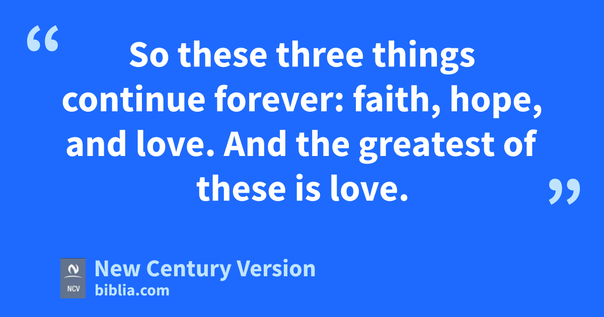 8 Love never ends. There are gifts of prophecy, but they will be ended. There are gifts of speaking in different languages, but those gifts will stop. There is the gift of knowledge, but it will come to an end. 9 The reason is that our knowledge and our ability to prophesy are not perfect. 10 But when perfection comes, the things that are not perfect will end. 11 When I was a child, I talked like a child, I thought like a child, I reasoned like a child. When I became a man, I stopped those childish ways. 12 It is the same with us. Now we see a dim reflection, as if we were looking into a mirror, but then we shall see clearly. Now I know only a part, but then I will know fully, as God has known me. 13 So these three things continue forever: faith, hope, and love. And the greatest of these is love.