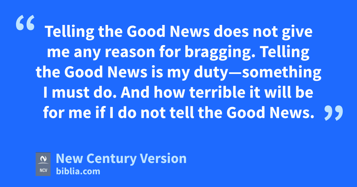 15 But I have not used any of these rights. And I am not writing this now to get anything from you. I would rather die than to have my reason for bragging taken away. 16 Telling the Good News does not give me any reason for bragging. Telling the Good News is my duty—something I must do. And how terrible it will be for me if I do not tell the Good News. 17 If I preach because it is my own choice, I have a reward. But if I preach and it is not my choice to do so, I am only doing the duty that was given to me. 18 So what reward do I get? This is my reward: that when I tell the Good News I can offer it freely. I do not use my full rights in my work of preaching the Good News.