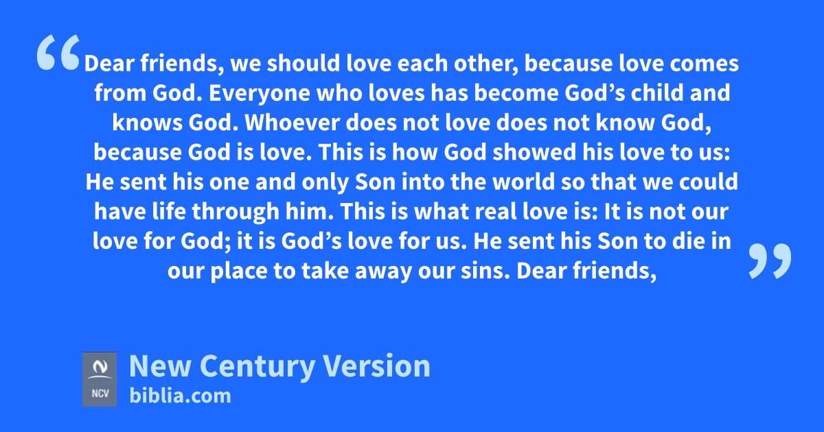 7 Dear friends, we should love each other, because love comes from God. Everyone who loves has become God’s child and knows God. 8 Whoever does not love does not know God, because God is love. 9 This is how God showed his love to us: He sent his one and only Son into the world so that we could have life through him. 10 This is what real love is: It is not our love for God; it is God’s love for us. He sent his Son to die in our place to take away our sins.