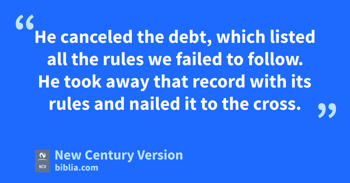 11 Also in Christ you had a different kind of circumcision, a circumcision not done by hands. It was through Christ’s circumcision, that is, his death, that you were made free from the power of your sinful self. 12 When you were baptized, you were buried with Christ, and you were raised up with him through your faith in God’s power that was shown when he raised Christ from the dead. 13 When you were spiritually dead because of your sins and because you were not free from the power of your sinful self, God made you alive with Christ, and he forgave all our sins. 14 He canceled the debt, which listed all the rules we failed to follow. He took away that record with its rules and nailed it to the cross. 15 God stripped the spiritual rulers and powers of their authority. With the cross, he won the victory and showed the world that they were powerless.