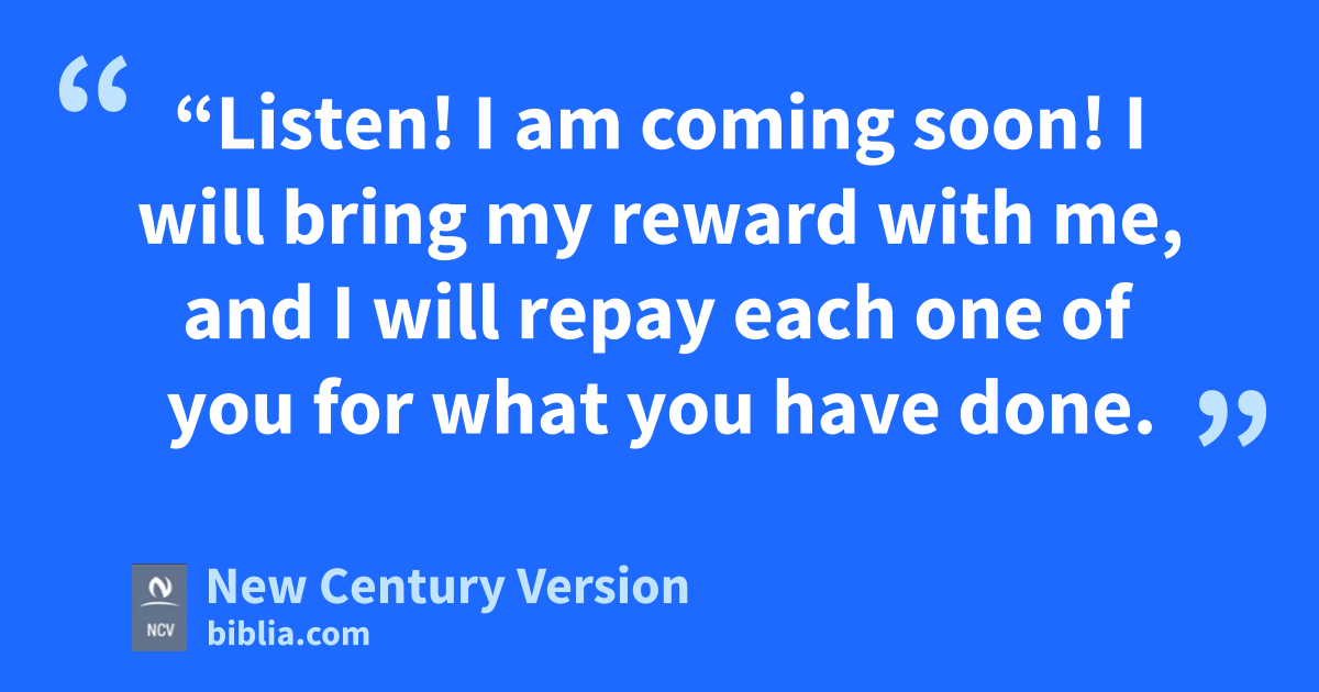 12 “Listen! I am coming soon! I will bring my reward with me, and I will repay each one of you for what you have done. 13 I am the Alpha and the Omega, n the First and the Last, the Beginning and the End.