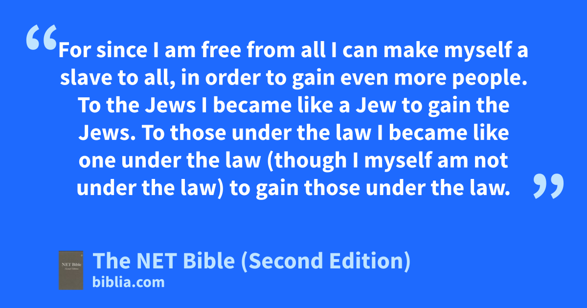For since I am free from all I can make myself a slave to all, in order to gain even more people. To the Jews I became like a Jew to gain the Jews. To those under the law I became like one under the law (though I myself am not under the law) to gain those under the law.