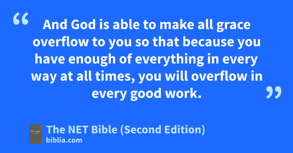 And God is able to make all grace overflow to you so that because you have enough of everything in every way at all times, you will overflow in every good work.