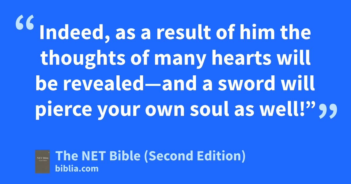 Indeed, as a result of him the thoughts of many hearts will be revealed—and a sword will pierce your own soul as well!”