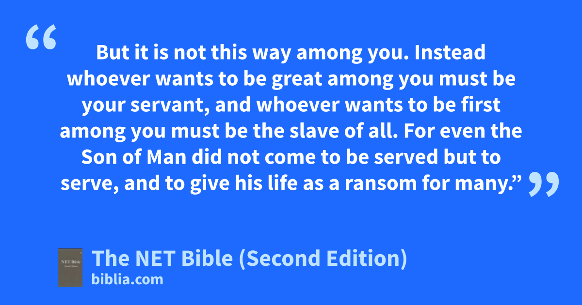 But it is not this way among you. Instead whoever wants to be great among you must be your servant, and whoever wants to be first among you must be the slave of all. For even the Son of Man did not come to be served but to serve, and to give his life as a ransom for many.”