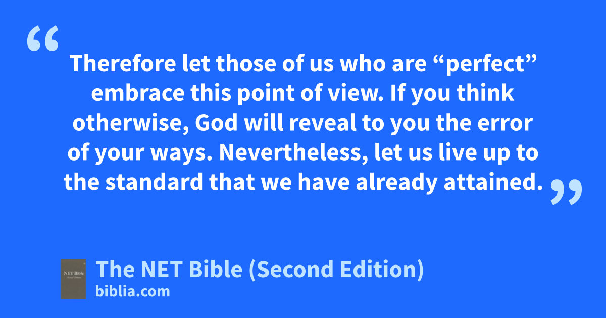 Therefore let those of us who are “perfect” embrace this point of view. If you think otherwise, God will reveal to you the error of your ways. Nevertheless, let us live up to the standard that we have already attained.