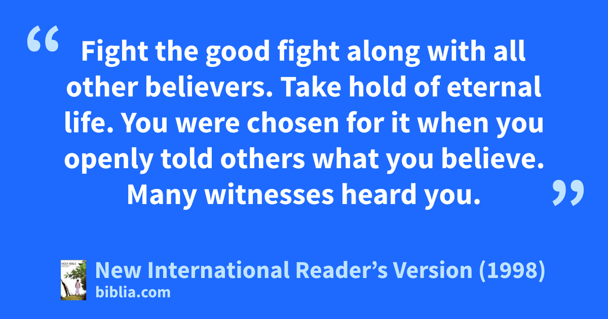 11But you are a man of God. Run away from all of those things. Try hard to do what is right and godly. Have faith, love and gentleness. Hold on to what you believe. 12Fight the good fight along with all other believers. Take hold of eternal life. You were chosen for it when you openly told others what you believe. Many witnesses heard you.