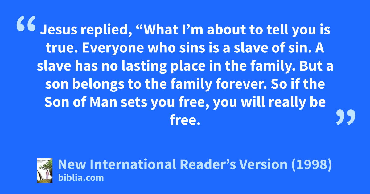 34Jesus replied, “What I’m about to tell you is true. Everyone who sins is a slave of sin. 35A slave has no lasting place in the family. But a son belongs to the family forever. 36So if the Son of Man sets you free, you will really be free.