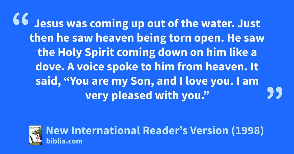 9At that time Jesus came from Nazareth in Galilee. John baptized him in the Jordan River. 10Jesus was coming up out of the water. Just then he saw heaven being torn open. He saw the Holy Spirit coming down on him like a dove. 11A voice spoke to him from heaven. It said, “You are my Son, and I love you. I am very pleased with you.”