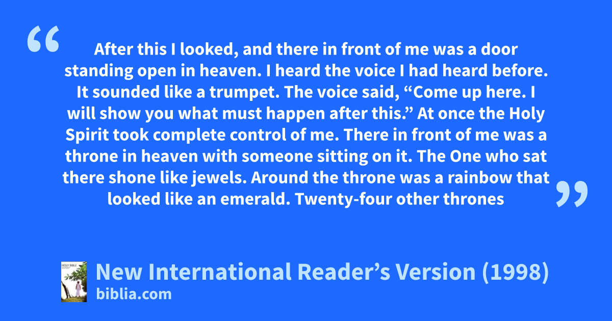 2At once the Holy Spirit took complete control of me. There in front of me was a throne in heaven with someone sitting on it. 3The One who sat there shone like jewels. Around the throne was a rainbow that looked like an emerald.