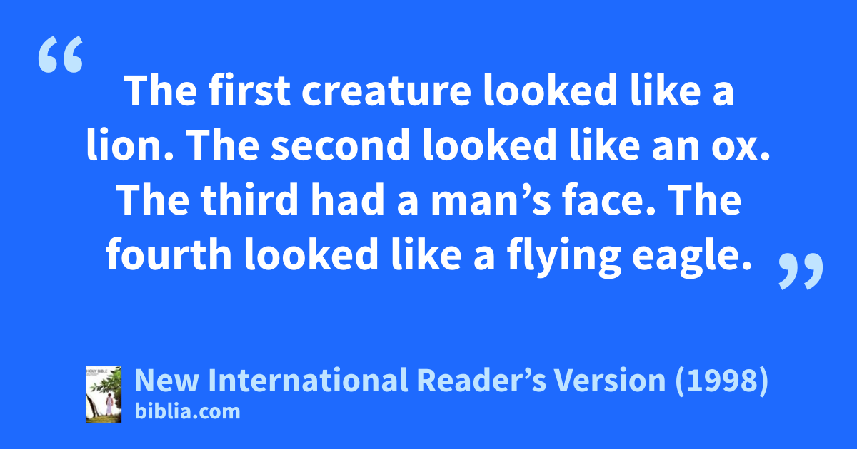 In the inner circle, around the throne, were four living creatures. They were covered with eyes, in front and in back. 7The first creature looked like a lion. The second looked like an ox. The third had a man’s face. The fourth looked like a flying eagle. 8Each of the four living creatures had six wings. Each creature was covered all over with eyes, even under the wings. Day and night, they never stop saying,