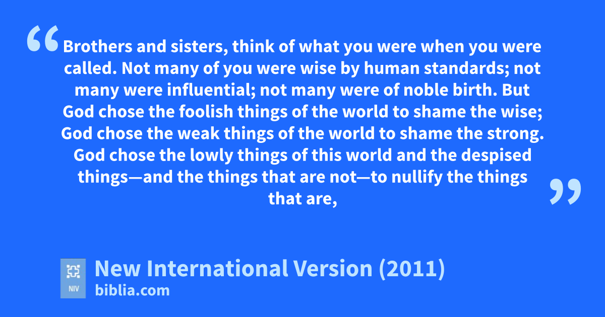 26 Brothers and sisters, think of what you were when you were called.b Not many of you were wisec by human standards; not many were influential; not many were of noble birth. 27 But God chosed the foolishe things of the world to shame the wise; God chose the weak things of the world to shame the strong. 28 God chose the lowly things of this world and the despised things—and the things that are notf—to nullify the things that are, 29 so that no one may boast before him.g 30 It is because of him that you are in Christ Jesus,h who has become for us wisdom from God—that is, our righteousness,i holinessj and redemption.k 31 Therefore, as it is written: “Let the one who boasts boast in the Lord.”d l