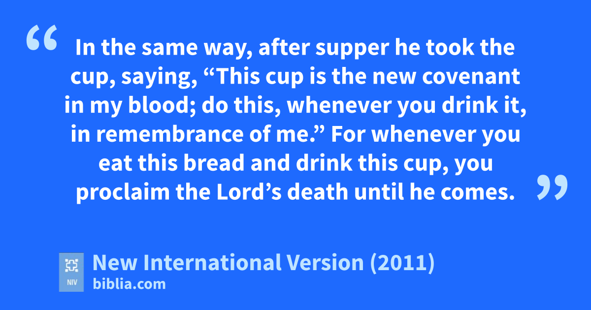 23 For I received from the Lordk what I also passed on to you:l The Lord Jesus, on the night he was betrayed, took bread, 24 and when he had given thanks, he broke it and said, “This is my body,m which is for you; do this in remembrance of me.” 25 In the same way, after supper he took the cup, saying, “This cup is the new covenantn in my blood;o do this, whenever you drink it, in remembrance of me.” 26 For whenever you eat this bread and drink this cup, you proclaim the Lord’s death until he comes.p