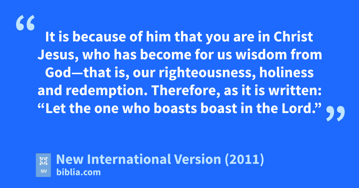 26 Brothers and sisters, think of what you were when you were called.b Not many of you were wisec by human standards; not many were influential; not many were of noble birth. 27 But God chosed the foolishe things of the world to shame the wise; God chose the weak things of the world to shame the strong. 28 God chose the lowly things of this world and the despised things—and the things that are notf—to nullify the things that are, 29 so that no one may boast before him.g 30 It is because of him that you are in Christ Jesus,h who has become for us wisdom from God—that is, our righteousness,i holinessj and redemption.k 31 Therefore, as it is written: “Let the one who boasts boast in the Lord.”d l