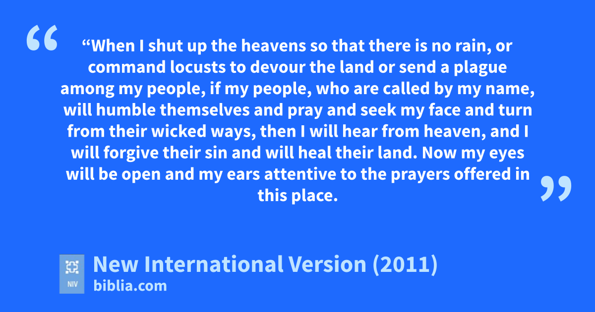 13 “When I shut up the heavens so that there is no rain,m or command locusts to devour the land or send a plague among my people, 14 if my people, who are called by my name,n will humbleo themselves and pray and seek my facep and turnq from their wicked ways, then I will hearr from heaven, and I will forgives their sin and will healt their land. 15 Now my eyes will be open and my ears attentive to the prayers offered in this place.u 16 I have chosenv and consecrated this temple so that my Name may be there forever. My eyes and my heart will always be there.
