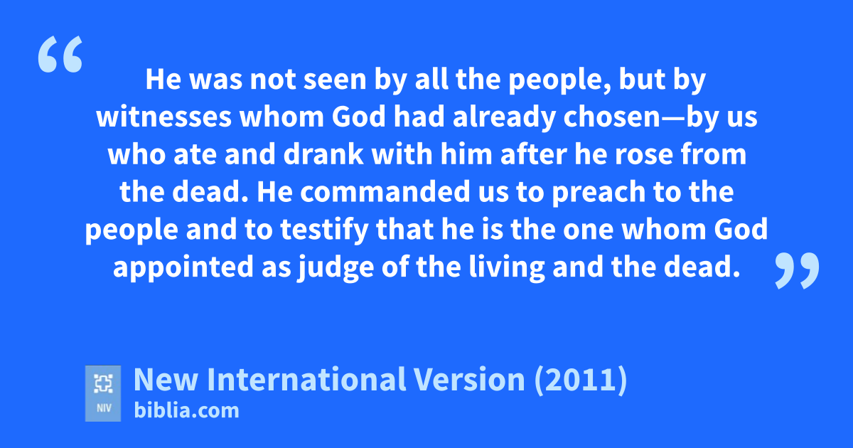 39 “We are witnessesz of everything he did in the country of the Jews and in Jerusalem. They killed him by hanging him on a cross,a 40 but God raised him from the deadb on the third day and caused him to be seen. 41 He was not seen by all the people,c but by witnesses whom God had already chosen—by us who ated and drank with him after he rose from the dead. 42 He commanded us to preach to the peoplee and to testify that he is the one whom God appointed as judge of the living and the dead.f 43 All the prophets testify about himg that everyoneh who believesi in him receives forgiveness of sins through his name.”j