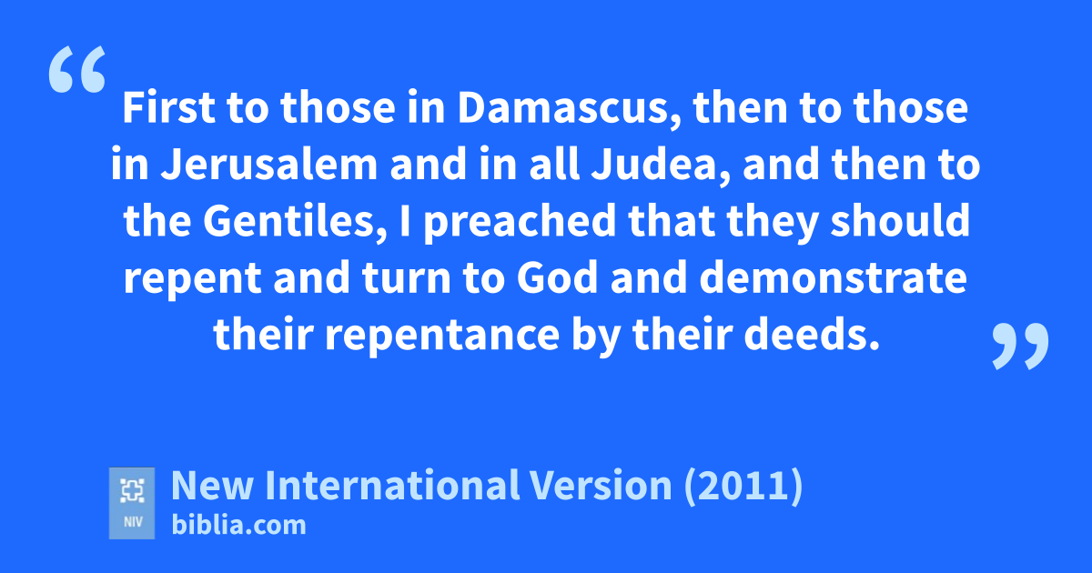 19 “So then, King Agrippa, I was not disobedients to the vision from heaven. 20 First to those in Damascus,t then to those in Jerusalemu and in all Judea, and then to the Gentiles,v I preached that they should repentw and turn to God and demonstrate their repentance by their deeds.x 21 That is why some Jews seized mey in the temple courts and tried to kill me.z 22 But God has helped me to this very day; so I stand here and testify to small and great alike. I am saying nothing beyond what the prophets and Moses said would happena—23 that the Messiah would sufferb and, as the first to rise from the dead,c would bring the message of light to his own people and to the Gentiles.”d