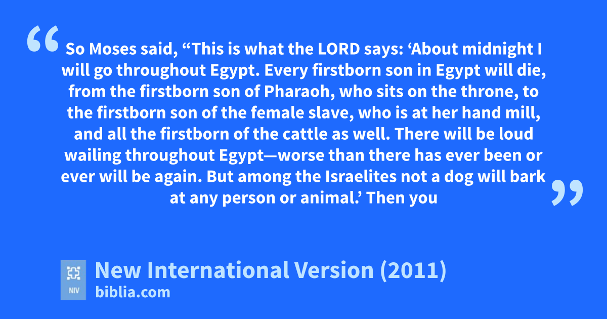 4 So Moses said, “This is what the Lord says: ‘About midnighth I will go throughout Egypt.i 5 Every firstbornj son in Egypt will die, from the firstborn son of Pharaoh, who sits on the throne, to the firstborn son of the female slave, who is at her hand mill,k and all the firstborn of the cattle as well. 6 There will be loud wailingl throughout Egypt—worse than there has ever been or ever will be again. 7 But among the Israelites not a dog will bark at any person or animal.’ Then you will know that the Lord makes a distinctionm between Egypt and Israel. 8 All these officials of yours will come to me, bowing down before me and saying, ‘Go,n you and all the people who follow you!’ After that I will leave.”o Then Moses, hot with anger, left Pharaoh.