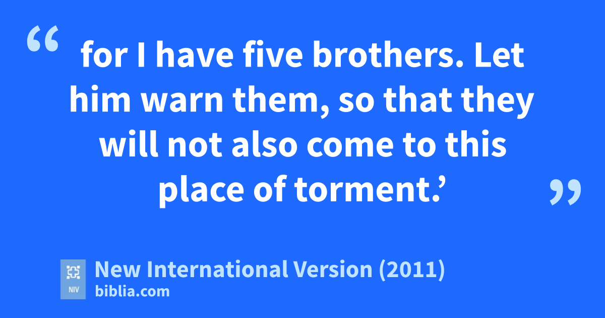 27 “He answered, ‘Then I beg you, father, send Lazarus to my family, 28 for I have five brothers. Let him warn them,o so that they will not also come to this place of torment.’