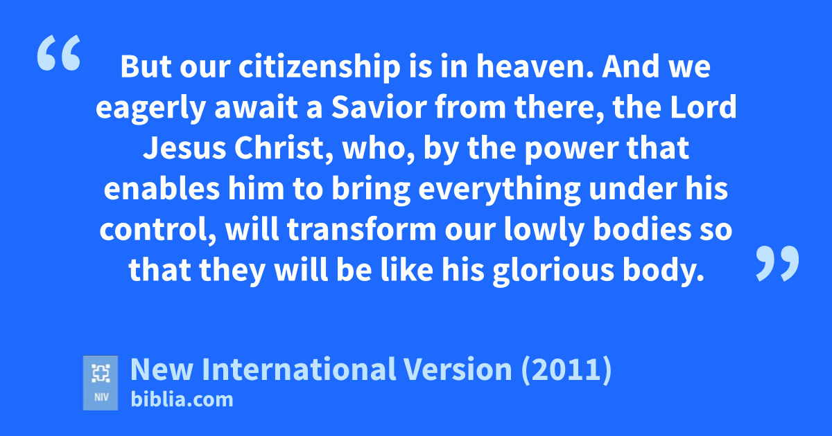 17 Join together in following my example,v brothers and sisters, and just as you have us as a model, keep your eyes on those who live as we do.w 18 For, as I have often told you before and now tell you again even with tears,x many live as enemies of the cross of Christ.y 19 Their destinyz is destruction, their god is their stomach,a and their glory is in their shame.b Their mind is set on earthly things.c 20 But our citizenshipd is in heaven.e And we eagerly await a Savior from there, the Lord Jesus Christ,f 21 who, by the powerg that enables him to bring everything under his control, will transform our lowly bodiesh so that they will be like his glorious body.i