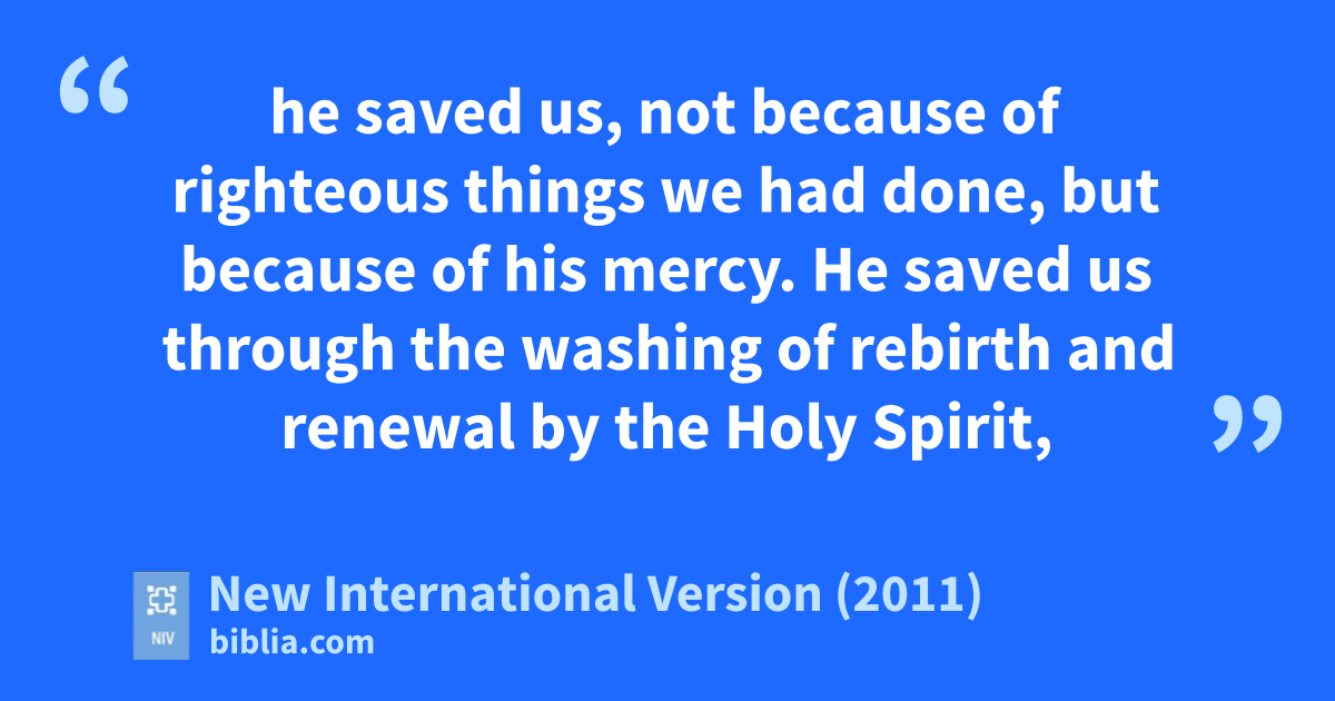 3 At one timez we too were foolish, disobedient, deceived and enslaved by all kinds of passions and pleasures. We lived in malice and envy, being hated and hating one another. 4 But when the kindnessa and love of God our Saviorb appeared,c 5 he saved us,d not because of righteous things we had done,e but because of his mercy.f He saved us through the washingg of rebirth and renewalh by the Holy Spirit, 6 whom he poured out on usi generously through Jesus Christ our Savior, 7 so that, having been justified by his grace,j we might become heirsk having the hopel of eternal life.m 8 This is a trustworthy saying.n And I want you to stress these things, so that those who have trusted in God may be careful to devote themselves to doing what is good.o These things are excellent and profitable for everyone.