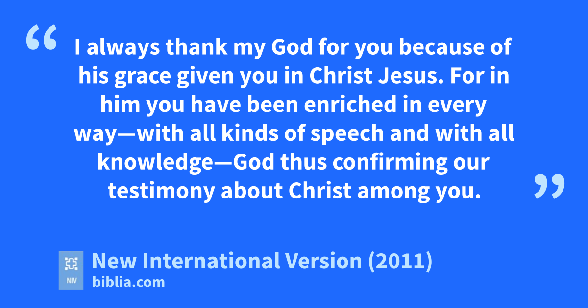 4 I always thank my God for youi because of his grace given you in Christ Jesus. 5 For in him you have been enrichedj in every way—with all kinds of speech and with all knowledgek—6 God thus confirming our testimonyl about Christ among you. 7 Therefore you do not lack any spiritual giftm as you eagerly wait for our Lord Jesus Christ to be revealed.n 8 He will also keep you firm to the end, so that you will be blamelesso on the day of our Lord Jesus Christ.p 9 God is faithful,q who has called your into fellowship with his Son, Jesus Christ our Lord.s