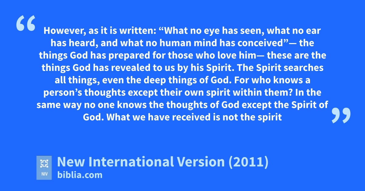 The Spirit searches all things, even the deep things of God. 11 For who knows a person’s thoughtse except their own spiritf within them? In the same way no one knows the thoughts of God except the Spirit of God. 12 What we have received is not the spiritg of the world,h but the Spirit who is from God, so that we may understand what God has freely given us. 13 This is what we speak, not in words taught us by human wisdomi but in words taught by the Spirit, explaining spiritual realities with Spirit-taught words.c 14 The person without the Spirit does not accept the things that come from the Spirit of Godj but considers them foolishness,k and cannot understand them because they are discerned only through the Spirit. 15 The person with the Spiritl makes judgments about all things, but such a person is not subject to merely human judgments, 16 for,