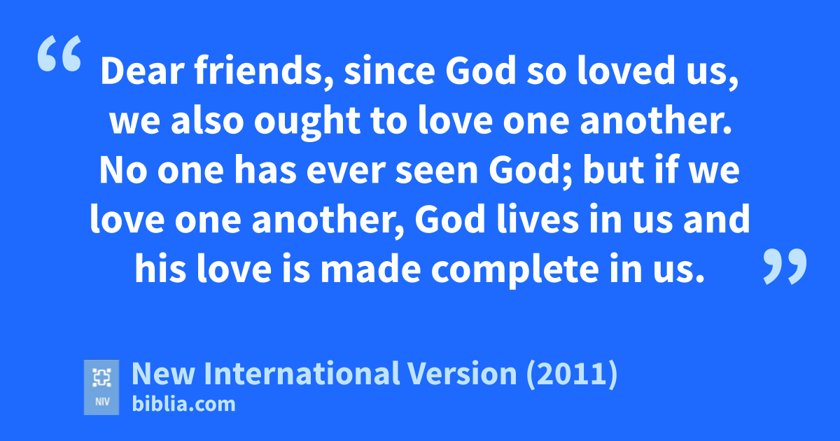 7 Dear friends, let us love one another,h for love comes from God. Everyone who loves has been born of Godi and knows God.j 8 Whoever does not love does not know God, because God is love.k 9 This is how God showed his love among us: He sent his one and only Sonl into the world that we might live through him.m 10 This is love: not that we loved God, but that he loved usn and sent his Son as an atoning sacrifice for our sins.o 11 Dear friends,p since God so loved us,q we also ought to love one another.r 12 No one has ever seen God;s but if we love one another, God lives in us and his love is made complete in us.t
