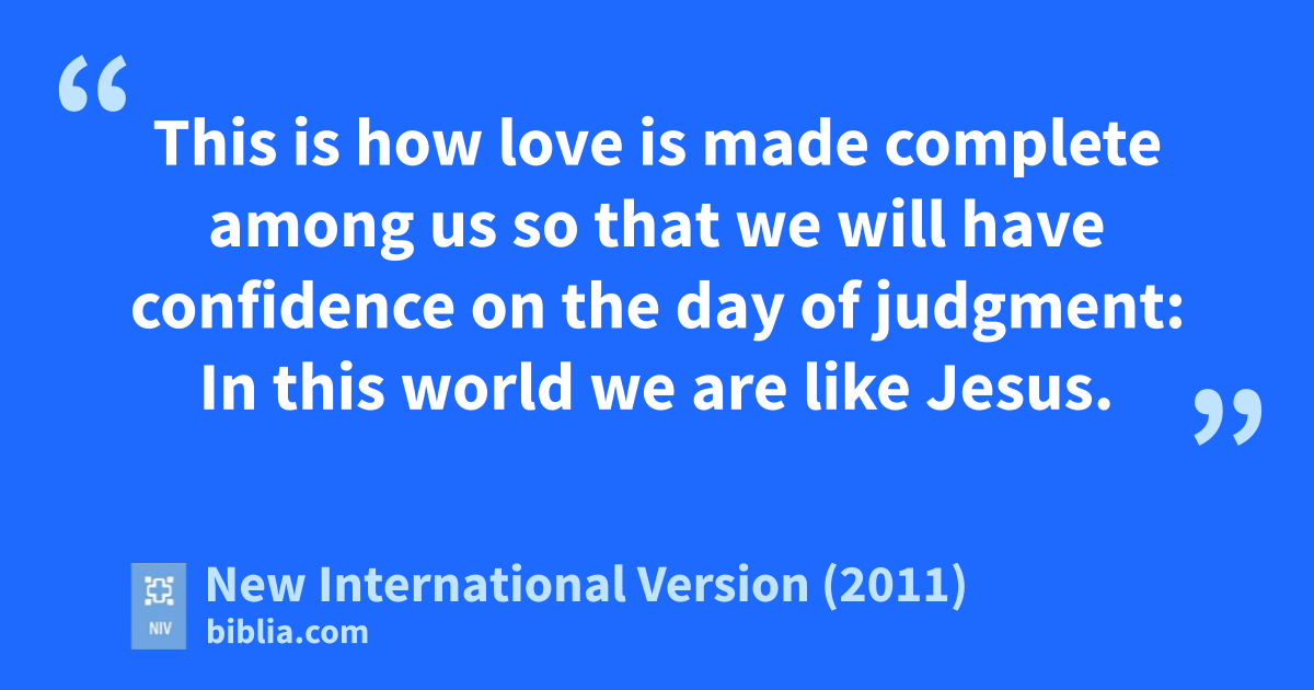 God is love.a Whoever lives in love lives in God, and God in them.b 17 This is how love is made completec among us so that we will have confidenced on the day of judgment:e In this world we are like Jesus. 18 There is no fear in love. But perfect love drives out fear,f because fear has to do with punishment. The one who fears is not made perfect in love.