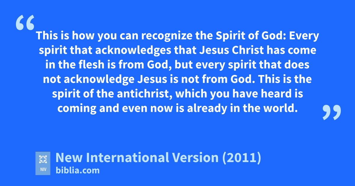 4 Dear friends,s do not believe every spirit,t but test the spirits to see whether they are from God, because many false prophets have gone out into the world.u 2 This is how you can recognize the Spirit of God: Every spirit that acknowledges that Jesus Christ has come in the fleshv is from God,w 3 but every spirit that does not acknowledge Jesus is not from God. This is the spirit of the antichrist,x which you have heard is coming and even now is already in the world.y