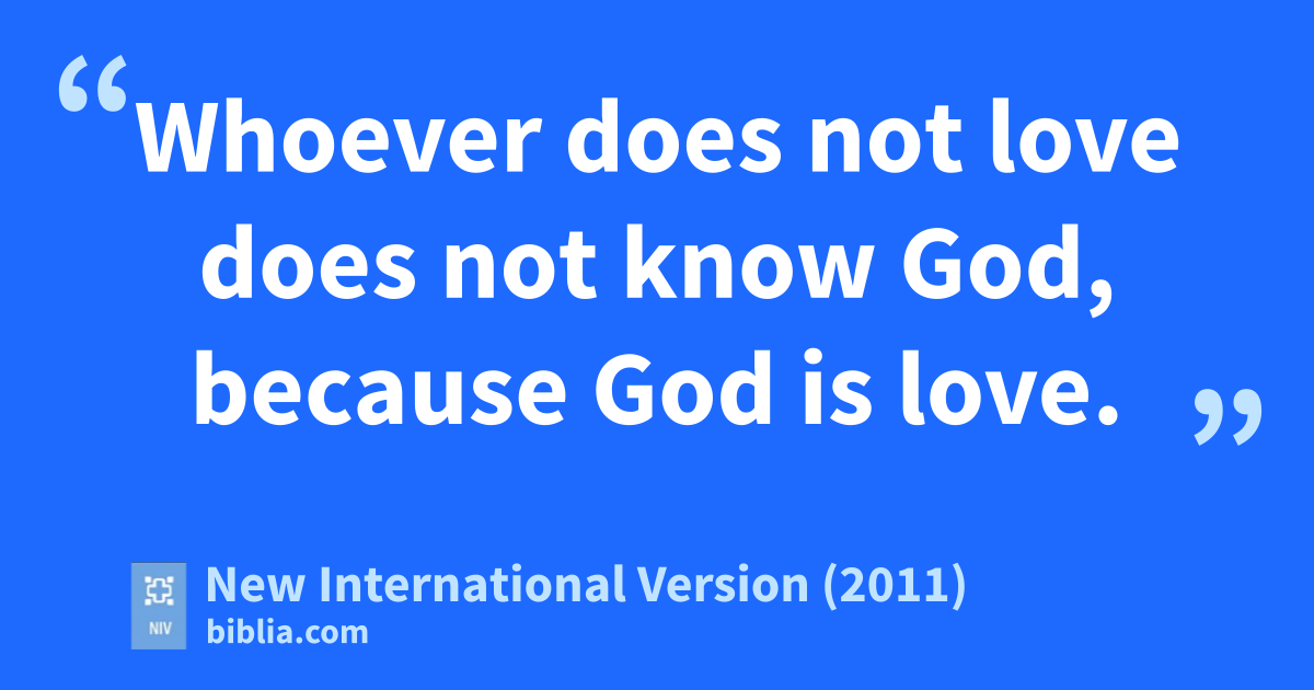 7 Dear friends, let us love one another,h for love comes from God. Everyone who loves has been born of Godi and knows God.j 8 Whoever does not love does not know God, because God is love.k 9 This is how God showed his love among us: He sent his one and only Sonl into the world that we might live through him.m 10 This is love: not that we loved God, but that he loved usn and sent his Son as an atoning sacrifice for our sins.o 11 Dear friends,p since God so loved us,q we also ought to love one another.r 12 No one has ever seen God;s but if we love one another, God lives in us and his love is made complete in us.t