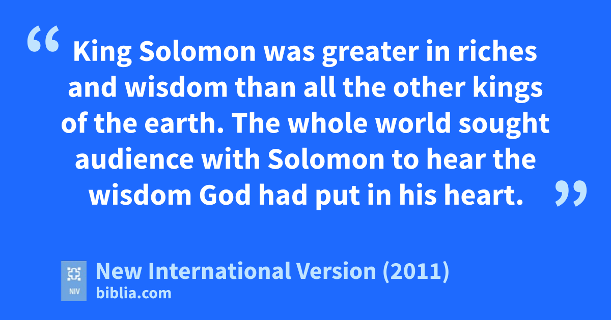 23 King Solomon was greater in richesh and wisdomi than all the other kings of the earth. 24 The whole world sought audience with Solomon to hear the wisdomj God had put in his heart. 25 Year after year, everyone who came brought a giftk—articles of silver and gold, robes, weapons and spices, and horses and mules.