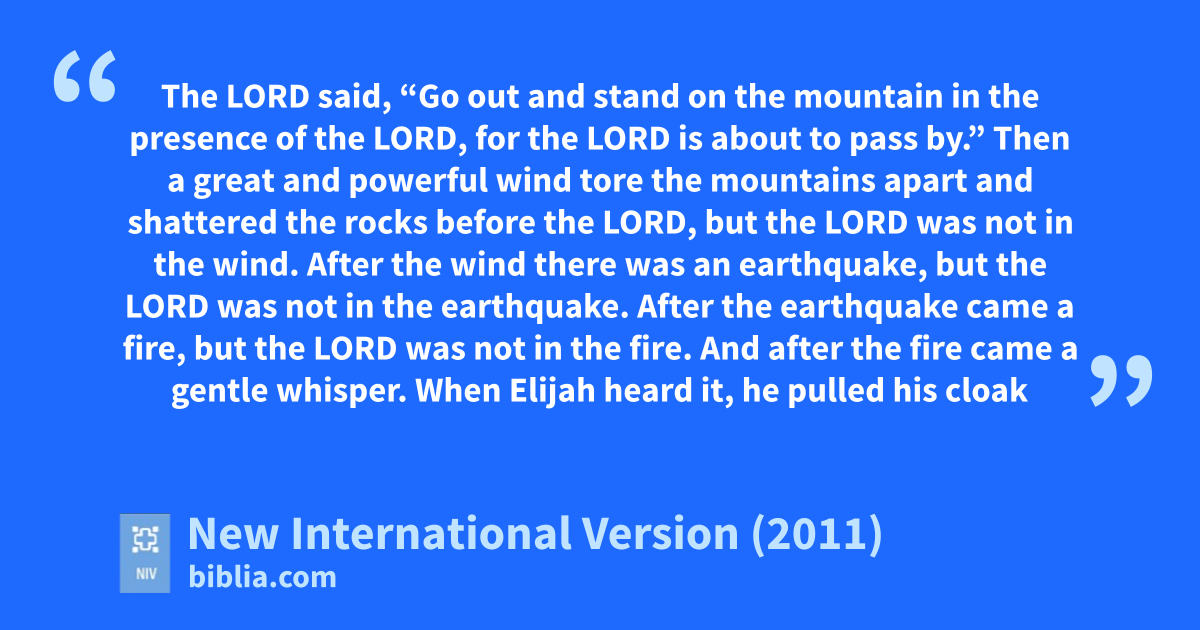 Then a great and powerful windt tore the mountains apart and shatteredu the rocks before the Lord, but the Lord was not in the wind. After the wind there was an earthquake, but the Lord was not in the earthquake. 12 After the earthquake came a fire,v but the Lord was not in the fire. And after the fire came a gentle whisper.w 13 When Elijah heard it, he pulled his cloak over his facex and went out and stood at the mouth of the cave.