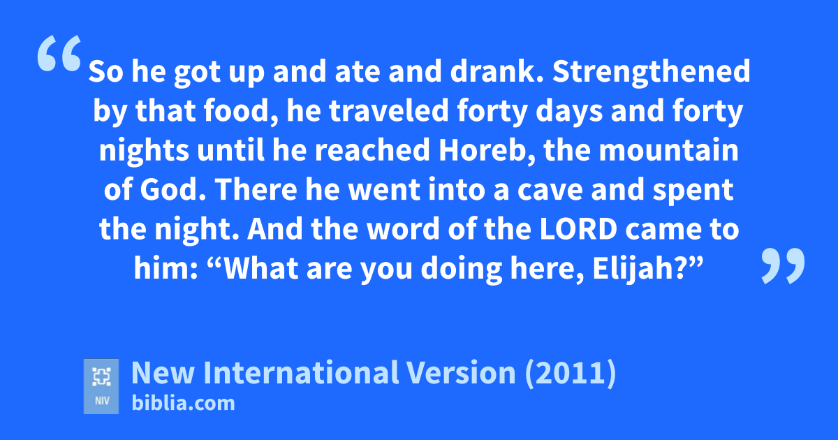 7 The angel of the Lord came back a second time and touched him and said, “Get up and eat, for the journey is too much for you.” 8 So he got up and ate and drank. Strengthened by that food, he traveled fortyj days and forty nights until he reached Horeb,k the mountain of God. 9 There he went into a cavel and spent the night.