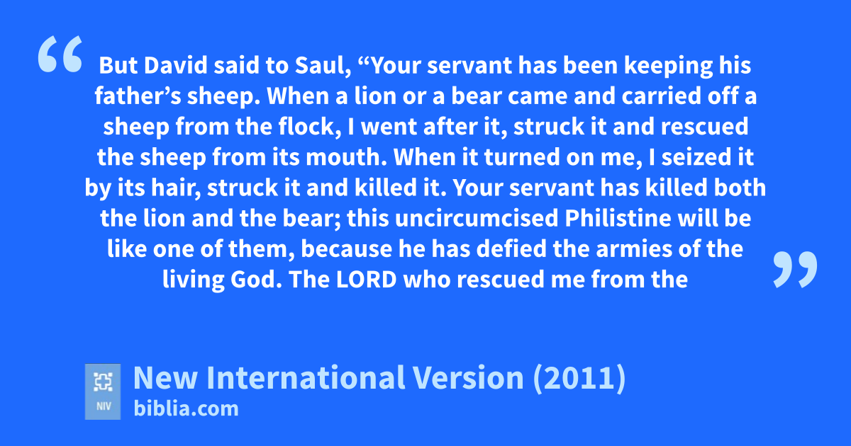 34 But David said to Saul, “Your servant has been keeping his father’s sheep. When a lionk or a bear came and carried off a sheep from the flock, 35 I went after it, struck it and rescued the sheep from its mouth. When it turned on me, I seizedl it by its hair, struck it and killed it. 36 Your servant has killed both the lionm and the bear; this uncircumcised Philistine will be like one of them, because he has defied the armies of the living God. 37 The Lord who rescuedn me from the paw of the liono and the paw of the bear will rescue me from the hand of this Philistine.”
