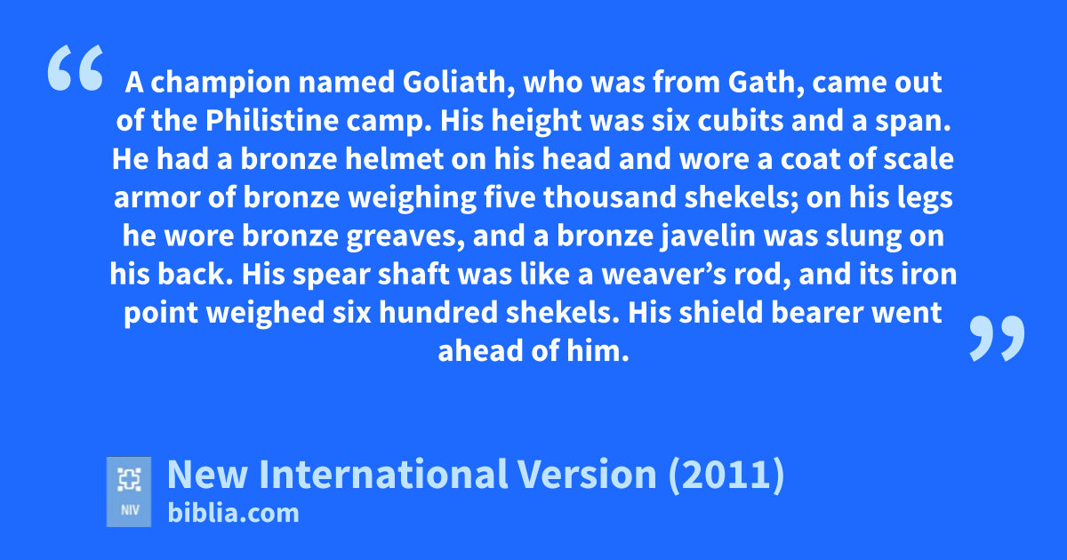 4 A champion named Goliath,g who was from Gath, came out of the Philistine camp. His height was six cubits and a span.a 5 He had a bronze helmet on his head and wore a coat of scale armor of bronze weighing five thousand shekelsb; 6 on his legs he wore bronze greaves, and a bronze javelinh was slung on his back. 7 His spear shaft was like a weaver’s rod,i and its iron point weighed six hundred shekels.c His shield bearerj went ahead of him.
